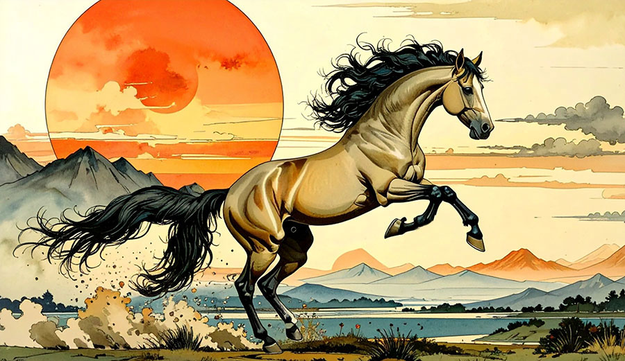 The Horse – wu – represents the month of June, the month of the summer solstice, according to the Chinese calendar. This time signifies the peak of summer when all plants are full and ripe with fruit. The yang energy reaches its highest point on the summer solstice – symbolised by the horse – which embodies strength, endurance, and vibrant energy, but besides its lively spirit, the horse also embodies gentleness and sensitivity, which are evident in its demeanour and healing abilities. Horses are intuitive. We can harness this energy to gain visions of what lies ahead. 2026 marks a pivotal year when we shift from moving forward to inward reflection.